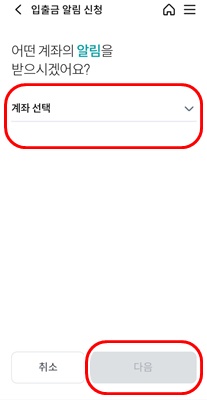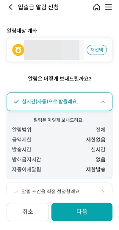 계좌선택을 눌러 알림 받고 싶은 계좌를 선택하고 다음을 눌러주세요. 알림은 실시간 알림과 원하는 알림 조건을 선택하여 받을 수 있습니다. 실시간 알림은 금액과 시간제한 없이 실시간으로 알려줍니다.