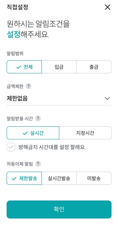 거래금액만 표시, 잔액까지 표시, 1만 원 이상만 금액을 설정하여 알림 받고 싶다거나, 시간을 지정해 지정한 시간에는 알림을 받고 싶지 않다거나, 자동이체는 알림이 오지 않도록 원하는 조건대로 설정하여 신청할 수 있습니다.