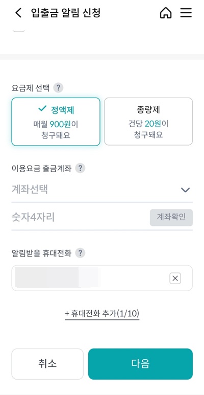 ◾ 비용 : 정액제 월 900원, 종량제 문자 1건당 20원 중 선택하여 가입. 매월 문자 알림 건수가 45건 이상이라면 월 900원 정액제 요금제가 효율적이겠죠!
