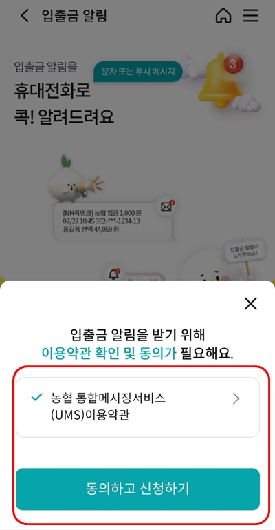 ◾ NH 콕 뱅크앱의 경우 로그인 하시고 우측상단 돋보기를 눌러 "입출금 알림"을 검색하시면 입출금 알림 설정에 아래와 같은 화면이 나옵니다. 문자 알림 신청을 누르고 약관에 동의하고 신청하기를 눌러줍니다.