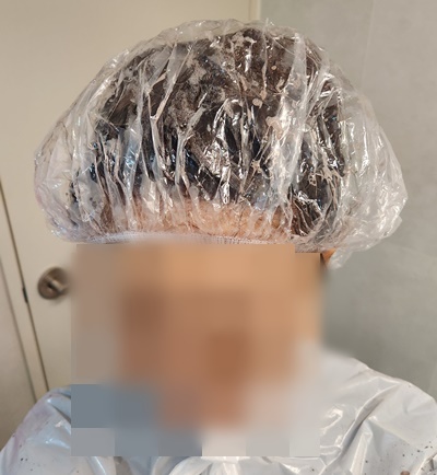 다 바르고 집에 예전에 사놓은 헤어캡이 있어서 헤어캡을 쓰고 있었습니다. 가운으로 머리를 감싸고 있어도 되긴 하지만 가운이 커서 간편한 헤어캡을 사용했습니다.